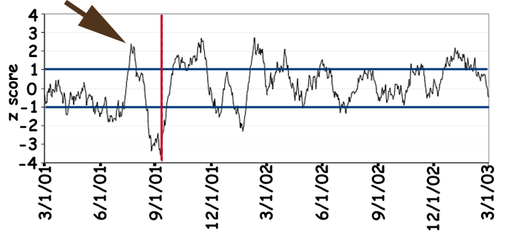 Experiment #4 Psychic ability or Psi is a given today to those who have done their homework. A recent research project took all of the known studies on psi for the past 100 years and treated them as a single study. The results showed that psi was indeed real with odds against chance in the trillions. I am not going to talk about psi here, but I wanted to show you a graph before I moved on. There is a web site at: <http://www.gotpsi.org> If you go there you can test your psychic ability. Below is a graph taken from the psychic card test on that site. Note that days before the attack on 9/11 the data gets strange (arrow) Then it started dropping until the attack (red line). Then it wasn’t until March of 2002 that it truly went back to normal levels (blue lines).