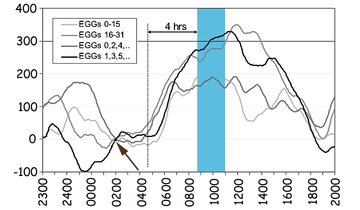 Experiment #4 Did you catch what was going on in the graph on the previous page? We just violated our third law for a mechanical really. The card data knew about the attack on 9/11 before it happened. A precognition of the people playing the card game without them knowing they were doing it. It was like it was floating in the air before the attack. But if you think this was just a fluke think again. The same thing happened with the Global Consciousness project computers (EEGs), as seen below. The time is NY 24 hr. and there were 32 EEGs in 4 lines. Note that the graph merged at 2:00 am, brown arrow, and then became more coherent for four hours before the attack, blue area.