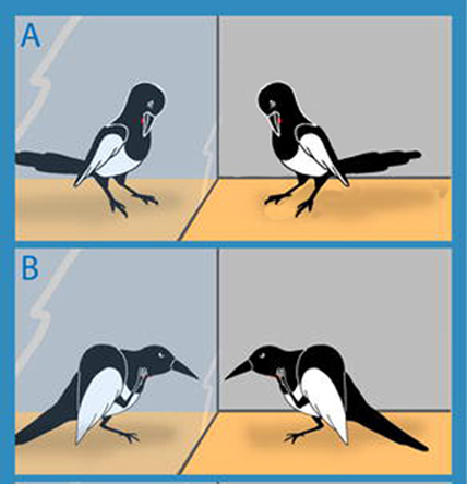 Consciousness in Nature The test was done at Goethe University in Frankfurt Germany. They took five Magpies, a bird with a brain the size of a nut, and put mirrors in their living space and let them experiment with them. Then they painted a mark on their throat, where they could only see it if they were looking in the mirror. When the experiment was done, all of the birds, except one stood at the mirror and tried to remove the spot. In Picture “A” to the right he is using his beak to try and rub it off. In picture “B” he is trying to rub it with his claws. The one that didn’t stand at the mirror, did appear to notice the spot, but didn’t seem to care. Clearly Brain size is not a factor in self-awareness. We can't give we can't give plants and insects a mirror test but some experiments do indicate a consciousness. Let’s look next at just a few of the dozens of studies.